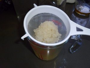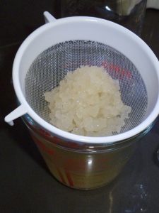 After 2-3 days strain the mixture through a small sieve into another glass jar. You can now drink the kefir liquid and store it in the fridge. Try a small glass to see if you like it and if it agrees with you. Keep the kefir grains to reuse.